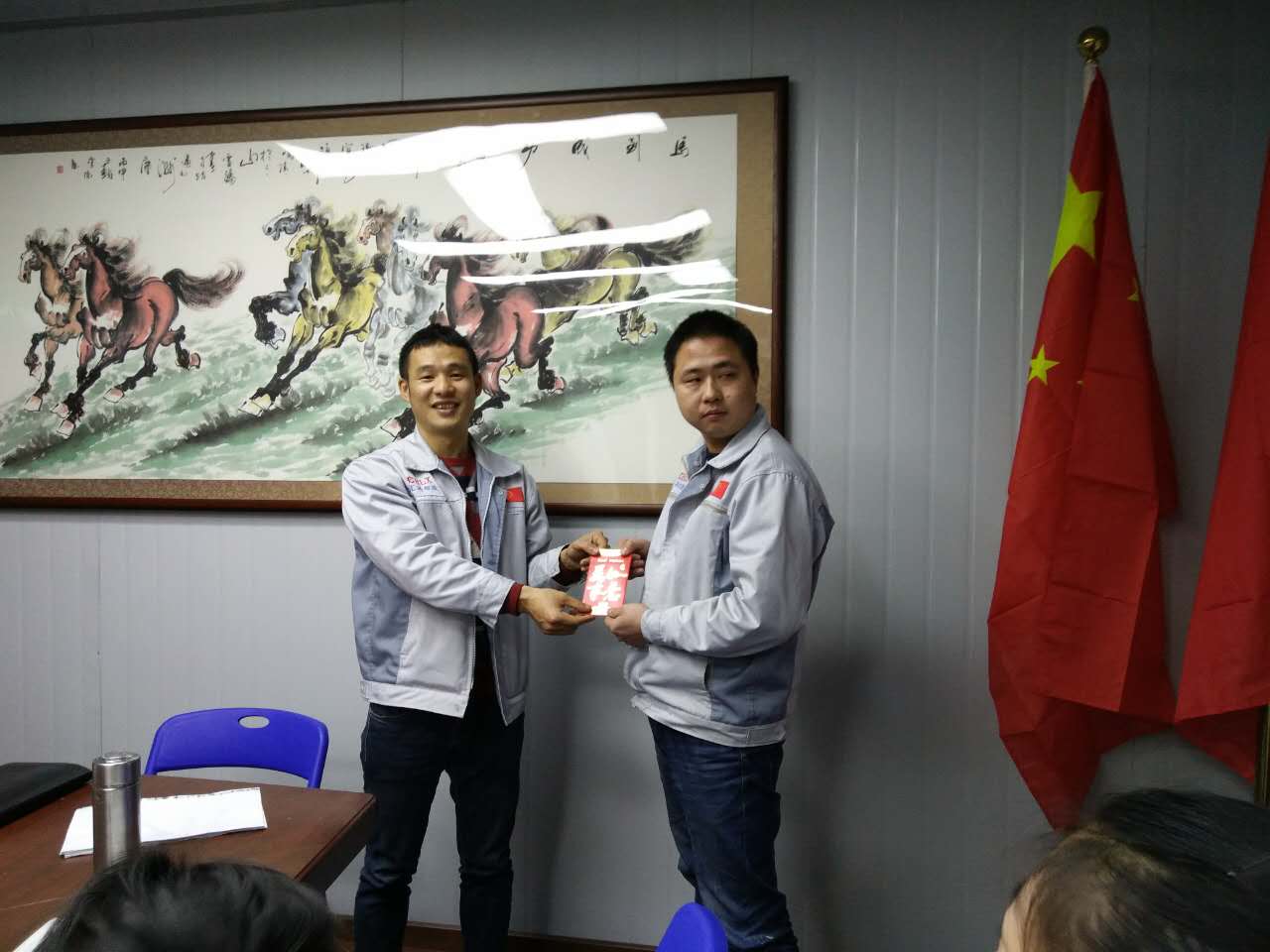 大會進行到尾聲,對每月度之星的選舉。胡總(圖左)為月度之星徐財華戰士(圖右)頒發獎金。同時感謝他對于公司的無私奉獻,對于同事的無微關懷,并擁護匯利興這個大家庭;同時匯利興還有很多人都在默默地奉獻與努力(例如:成都辦事處的張國桃經理,在今年6月17日與戰車傳奇進軍成都開疆擴土、奮戰近一年),在此感謝他無私的奉獻。匯興智造有著你們這群人的努力與付出,相信我們會更加靠近我們的夢,實現中國智能裝備全產業鏈集成智造標桿,繼續引領行業的發展。
