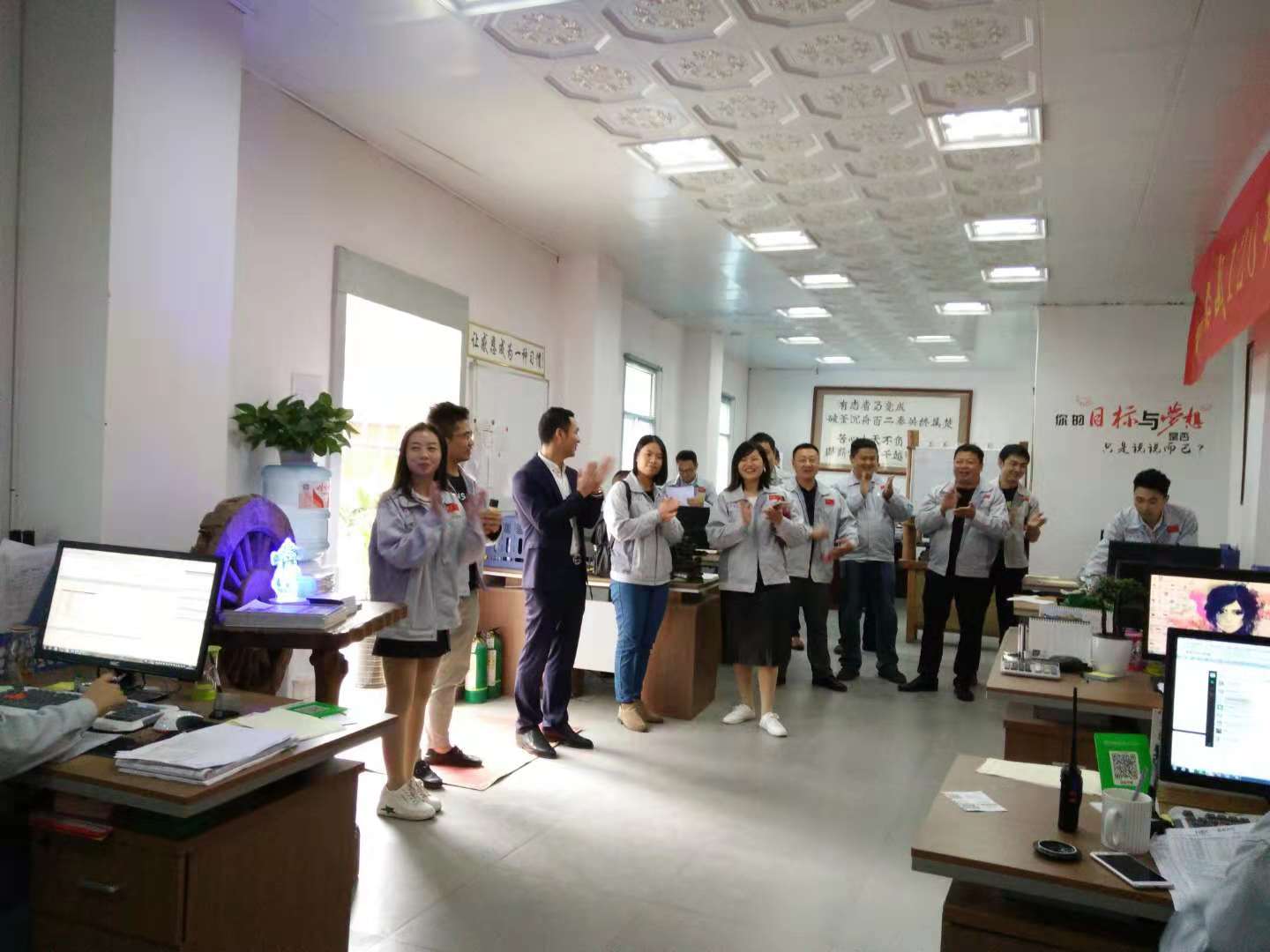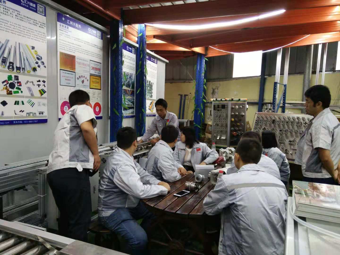 胡偉路總經理帶領集團代表一行認識了匯利興(重慶)公司贏銷部的家人們,并陪同集團代表一行參觀了匯利興(重慶)公司型材長材區及配件區,介紹了重慶公司的新利器-型材切割機,了解了重慶子公司一系列作業機械同時也參觀了9月份的參展線體,并現場相互交流了一些新創意、新想法,并表示匯利興(重慶)公司一系列文化及規模體系是值的稱贊得!同時胡偉路總經理表示,重慶公司的文化完全是授予集團公司的熏陶,在現有的文化上又創新了一些具備匯利興(重慶)公司的文化及作業體系,因此在廠容廠貌的結構上有些許新穎。  隨后,集團代表在胡偉路總經理的引導下參觀了重慶公司的匯利興學校后,大家齊聚一堂對相關技術問題相互進行了深入的溝通,大家一致認為孔子的這句“學而不思則罔,思而不學則殆”很是受用,因為只有不斷的努力學習,接觸新的想法及事物才能走在時代的前言上,才能不落后。